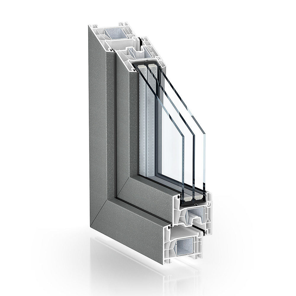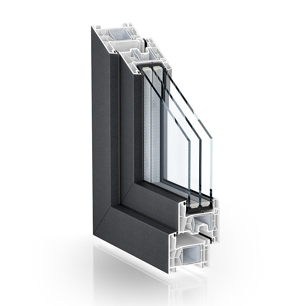 • Hochwärmedämmendes 5-Kammer Anschlagdichtungssystem mit 76mm Bautiefe, geradlinigem Design und schmalen Profilansichten